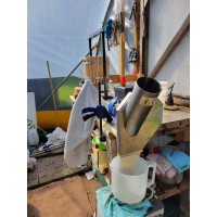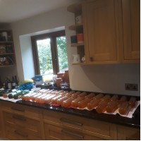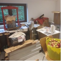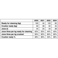 Photos of a) my makeshift crushing and pressing setup – this is between day 2 and 3 of the pressing action in 2022 (a bumper harvest year), and b) bottles cooling post-pasteurisation (with an apple tree in the background), are attached. In case it’s of any interest to you, stats of apple kilos picked and cleaned, and juice litres obtained are as below. Starting apples kg are probably about 40% windfall, 60% picked on the day.