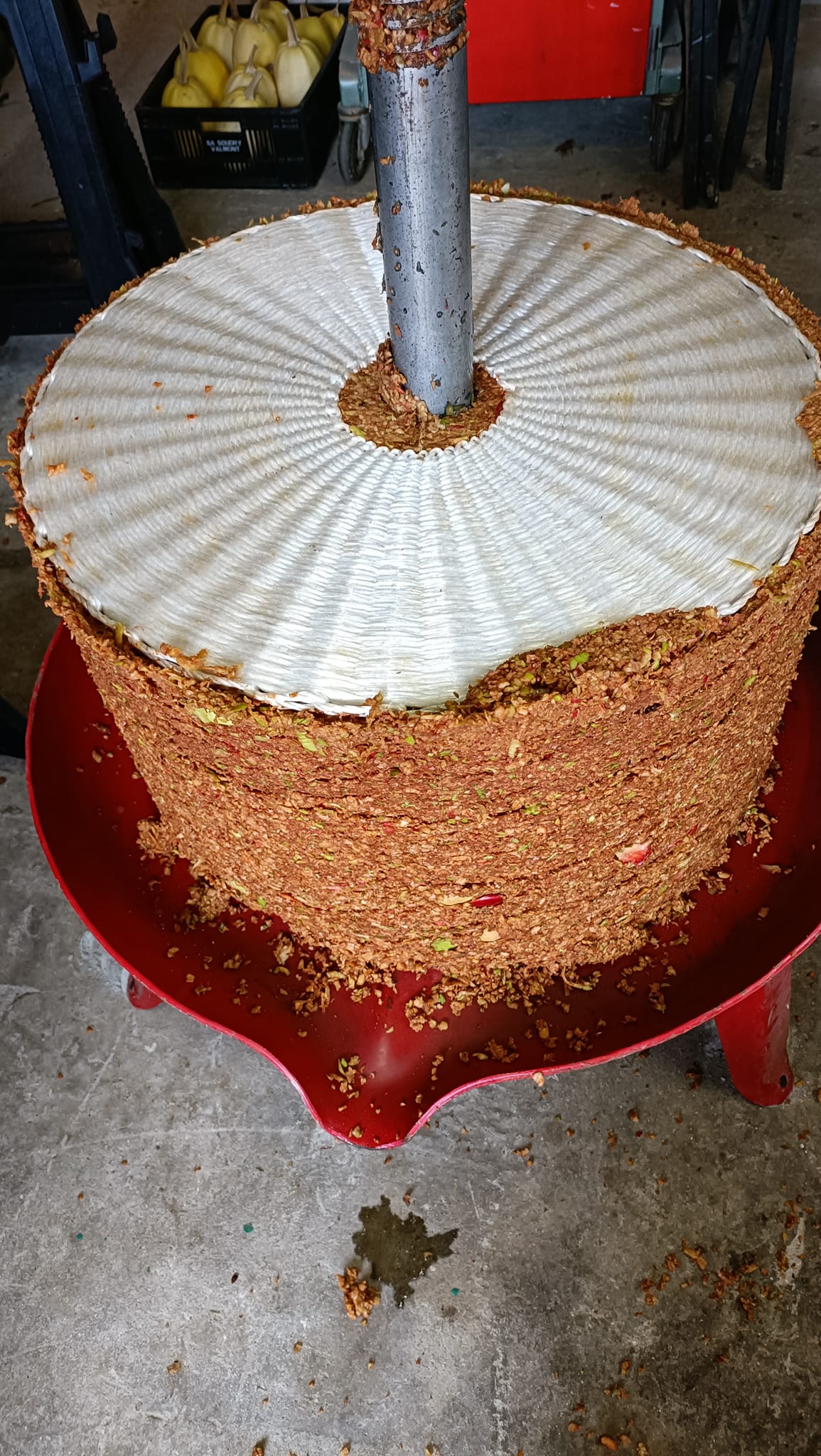Если вы располагаете большим количеством времени, то можно отжать еще на 5-10% больше сока. Для этого оставьте яблочную массу в конце отжима под гнетом домкрата или винта на несколько минут. После этого подкачайте домкрат и подождите ещё некоторое время. Повторяйте эту операцию, пока продолжает выделяется сок.